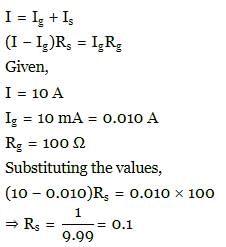 A galvanometer of 100 Ω resistance gives full scale deflection when 10 mA of current is passed. To convert it into 10 A range ammeter, the resistance of the shunt required will be