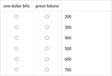 In the table, select the number of one-dollar bills and the number of green tokens present in the cash register at the end. Make only two selections, one in each column.