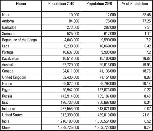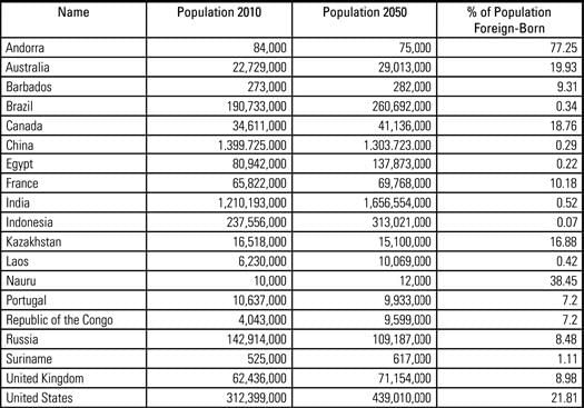 The table below gives 2010 population based on UN estimates and 2050 populations based on UN projections for 19 selected countries. The table also gives the UN estimates of the percentage of the population that is foreign-born for each country in 2010.
