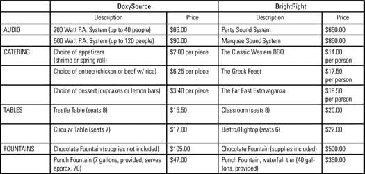 We have to choose a caterer for the upcoming gala. Two under consideration are DoxySource and BrightRight. Although DoxySource has delivered satisfactory service in the past, our First Annual Sponsors Gala promises to be the largest event we have ever hosted, and BrightRight is known for large event planning and production. However, I’d like more information before switching from a tried and true contractor. Also, I’d like to consider how to justify any over-budget costs from using BrightRight, if that comes up. I am committed to using only one provider. Please work up a comparison of costs of services and rentals for BrightRight and DoxySource. We require: tables, audio, food, and a punch fountain or fountains (a dessert fountain would be a lovely addition). Our budget is $6,000.00, and we plan for a maximum of 400 people.