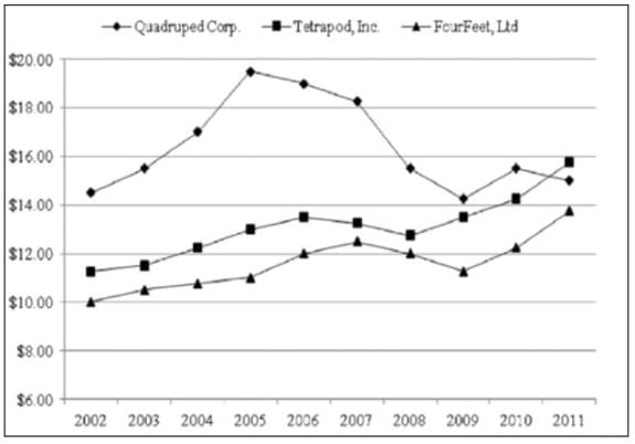 The graph shows the per share price of the stock of three companies at the end of each year between 2002 and 2011.