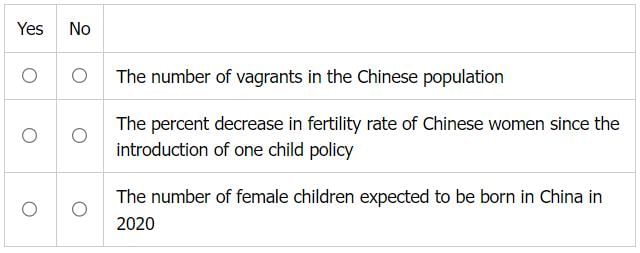 Q. Consider each of the items listed below. Select Yes if the item can be determined based on the information given in the three sources. Otherwise, select No.