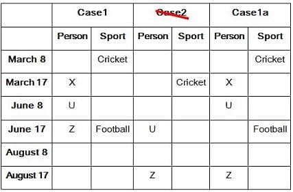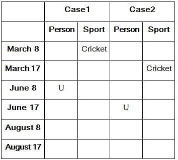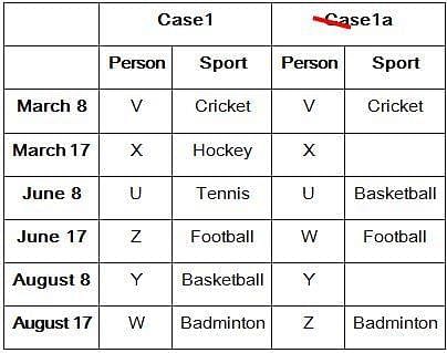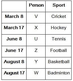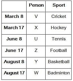 Six persons- U, V, W, X, Y, and Z like different sports-Cricket, Hockey, Badminton, Basketball, Football, and Tennis and they participated in this sports event on two different dates either 8 or 17 of three different months- March, June, and August of the same year. All the information is not necessarily in the same order.