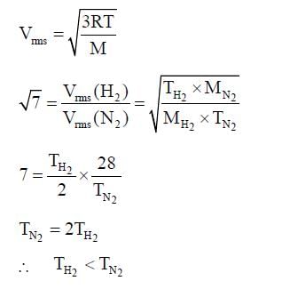 rms velocity of hydrogen is √7 times the rms velocity of nitrogen. If T is the temperature of gas,then: