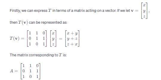 Let T : R3 →  R3 be the linear transformation defined by T(x, y, z) = (x + y, y + z, z + x) for all (x, y, z) ∈ R3. Then