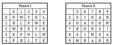 In the follow ing questions, a word is represented by only one set of numbers as given in the options. The set of numbers given in the options represents letters in the same sequence using the two given matrices. The columns and rows of matrix I are numbered from 0 to 4 and that of matrix II from 5 to 9. A letter from these matrices can be represented first by its row and next by column number.