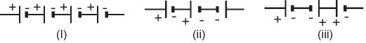 The proper representation of series combination of cells is that the negative terminal of the first cell is connected to the positive terminal of the second cell and the negative terminal of second cell is connected to the positive terminal of the third cell and so on.