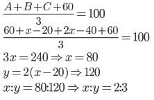 A, B एवं C के पास क्रमशः 40, x एवं y गेंदे है। यदि B,A को 20 गेंद देता है, तो B के पास गेंद की संख्या C की तुलना में आधी रह जाती है। यदि उनके पास 60 गेंद और अधिक होती, तो औसत 100 होता है। x एवं y का अनुपात है-