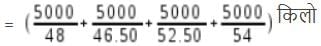 एक दुकानदार मार्च, अप्रैल, मई और जून के महीनों के लिए क्रमश: 48 रु/किलो, 46.50 रु/किलो, 52.50 रु/किलो और 54 रु/किलो में गेहूं खरीदता है । यदि दुकानदार प्रति माह 5000 रु खर्च करता है, तो प्रति किलो गेहूं की औसत लागत लगभग क्या है?