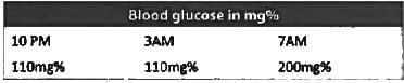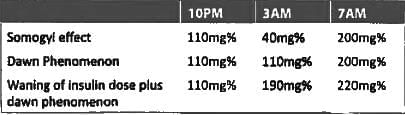 A type 1 DM patient on insulin is having consistent values of Pre-breakfast hyperglycemia. Hence the physician ordered self- monitoring of blood glucose including at night. The following record of blood sugar of patient is given below. Which is the correct description for the recording shown below? (Recent Pattern Questions)