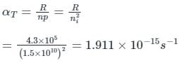 A pure silicon crystal with recombination constant αT has rate of recombination of 4.3 × 105 (cm3-sec)-1. The intrinsic carrier concentration is 1.5 × 1010 cm-3. A dopant with concentration 4.7 × 1016 cm-3 is added then the new constant of recombination at equilibrium is ________ × 10-15 s-1