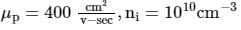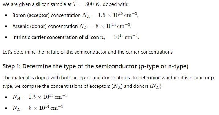 A sample of silicon at T = 300 K is doped with boron at a concentration of 1.5 × 1015 cm-3 and with arsenic at a concentration of 8 × 1014 cm-3. The intrinsic carrier concentration of Si at T = 300 K is 1010 cm-3.