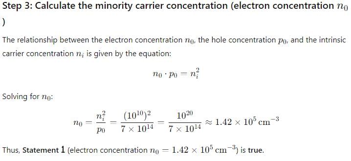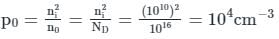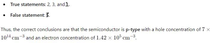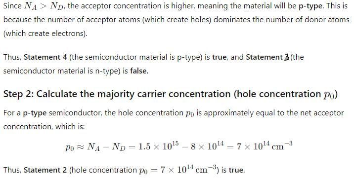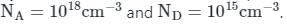 A sample of silicon at T = 300 K is doped with boron at a concentration of 1.5 × 1015 cm-3 and with arsenic at a concentration of 8 × 1014 cm-3. The intrinsic carrier concentration of Si at T = 300 K is 1010 cm-3. The material is