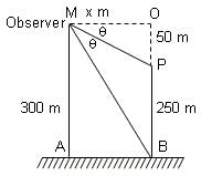 A 50 m high pole stands on a 250 m high building. To an observer at a height of 300 m, the building and the pole subtend equal angles. The distance of the observer from the top of the pole is