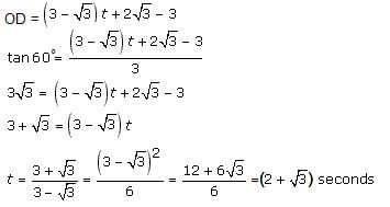 A rocket fired vertically moves according to the relation s = at + b, where s is in kilometres and t in seconds. When it was observed from a point on the ground, which is at a distance of 3 km from the point of projection, it was found that at t = 1 second, the angle of elevation was 30° and at t = 2 seconds, the angle of elevation was 45°. Find the time at which the angle of elevation is 60°.
