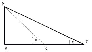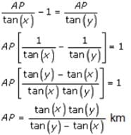A person sitting in an aeroplane, which is flying at a certain height, observes the angles of depression of two consecutive milestones lying at a distance of 1 km on the road to be x and y. Determine the height of the aeroplane above the ground.