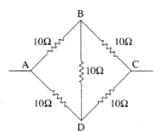 In a balanced Wheatstone bridge the points B and D are at the same potential. When battery is connected between A and C no current flows through BD. Therefore, the 10 ohm resistance of BD is ineffective. Therefore, resistance of ABC