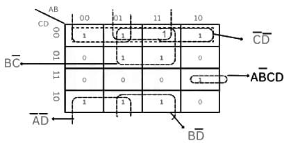 F(A, B, C, D) = ∑m(0, 1, 2, 3, 5, 7, 8, 9, 11, 14)