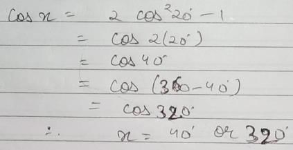 If cos 20° = k and cos x = 2k2-1, then the possible values of x between 0° and 360° are
