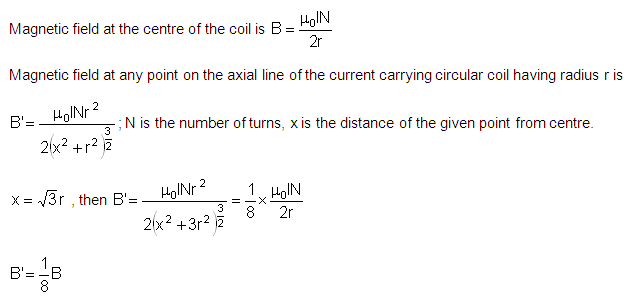 The magnetic field at the centre of a circular coil of radius r and carrying a current I is B. What is the magnetic field at a distance x =√3r from the centre on the axis of the coil?