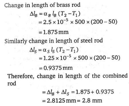 A brass rod of length 500 mm and diameter 3 mm is joined to a steel rod of same length and diameter at 50°C. If the coefficient of linear expansion of brass and steel are 2.5 × 10-5 °C-1 and 1.25 × 10-5 °C-1, then change in length of the combined rod at 200°C is