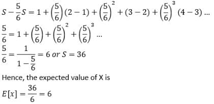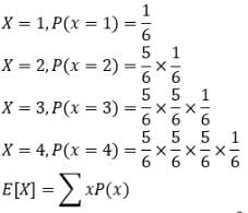 A fair die with faces {1, 2, 3, 4, 5, 6} is thrown repeatedly till ‘3’ is observed for the first time. Let X denote the number of times the die is thrown. The expected value of X is _____.