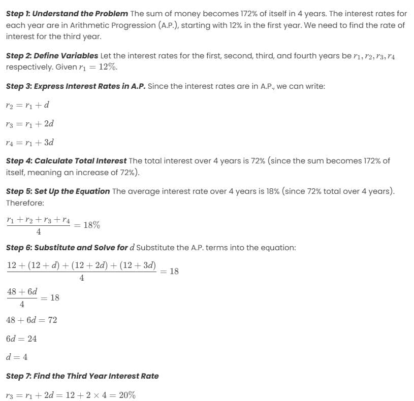 A sum of money becomes 172% of itself in 4 years when the rate of interest is different in different years. The interest obtained in the first, second, third and fourth years are in A.P. If the rate of interest in the first year is 12%, what is the rate of interest for the third year?