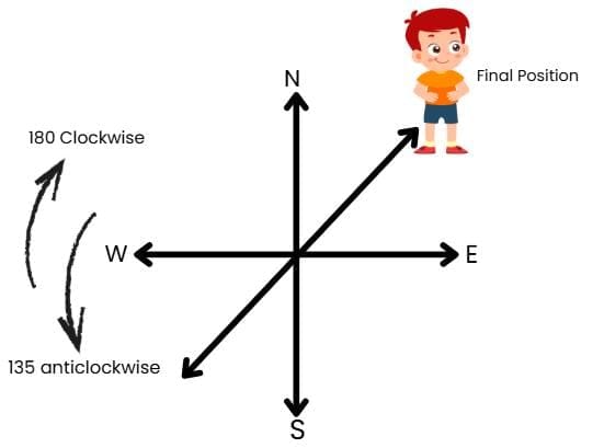 Rohan is facing North. He turns 135° in the anticlockwise direction and then 180° in the clockwise direction. Which direction is he facing now?