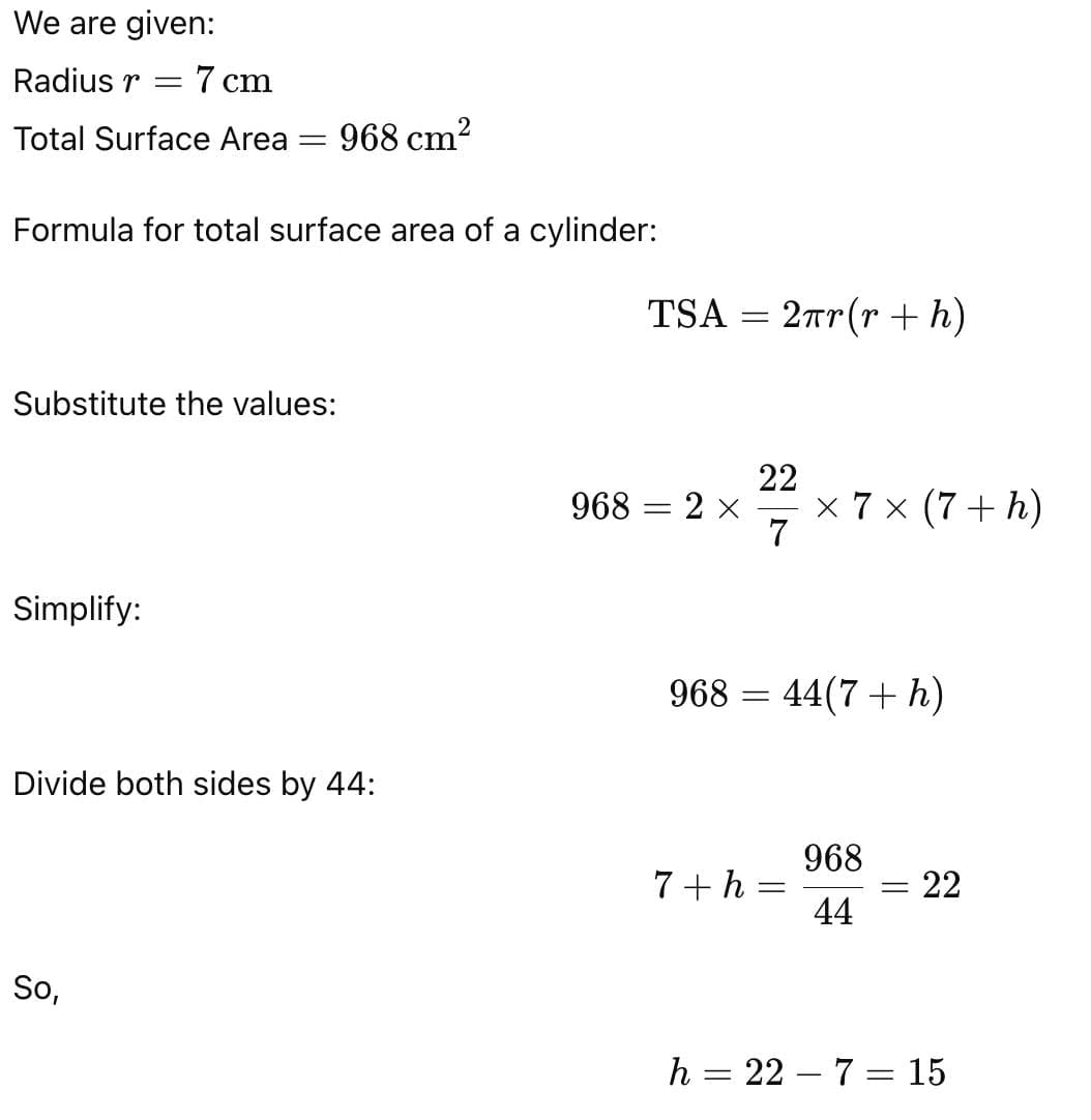 The height of a cylinder whose radius is 7 cm and the total surface area is 968 cm2 is: