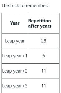 The calender of a nonleap year will only match a non-leap year that too which is either 6 or 11 years after it.