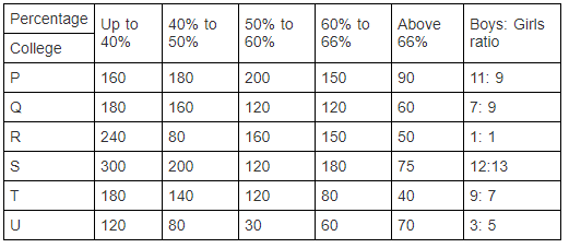 The following table shows the numbers of students scoring different percentages from 6 engineering colleges and ratio of the number of boys to girls in the colleges. (Note: 40% to 50% means above 40% and up to 50%)