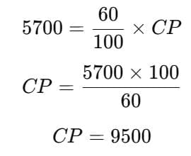 Meera incurred a loss of 40 per cent on selling an article for Rs. 5700/-. What was the cost of the article.