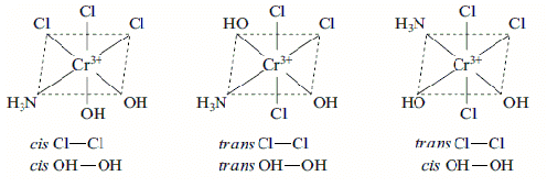 The number of geometrical isomers of [Cr(NH3)(OH)2Cl3]2– ion is