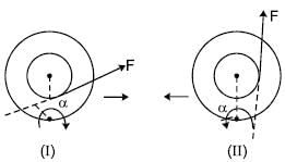 The string of a step rolling wheel is pulled by applying force F with different lines of action in two situations as shown. The wheel starts rolling without slipping due to application of the force :