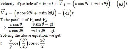 Two particles are projected simultaneously with the same speed vv in the same vertical plane with angles of elevation θ, and 2θ, where θ<45∘. At what time will velocities be parallel?