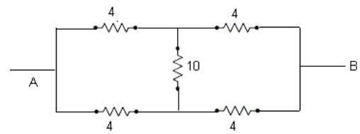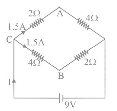 A network of four resistances is connected to 9 V battery, as shown in figure. The magnitude of voltage difference between the points A and B is ___________V.