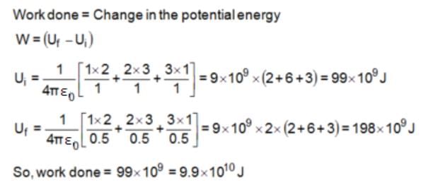 Three point charges of 1 C, 2 C and 3 C are placed at the corners of an equilateral triangle of side 1 m. The work done (in joules) in bringing these charges to the vertices of a smaller similar triangle of side 0.5 m is