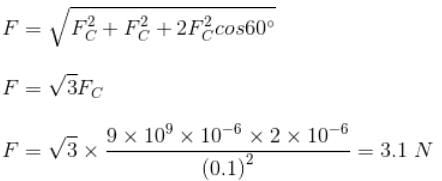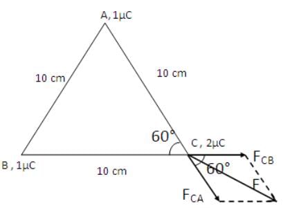Three charges 1 μC, 1μC and 2 μC are respectively kept at the vertices A, B and C of an equilateral triangle ABC of side 10 cm. The resultant force on the charge at C is