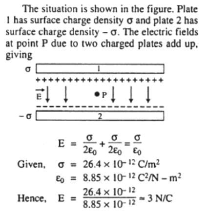 Two parallel, large and thin metal plates have equal surface charge densities (σ = 26.4 x 10-12 C/m2) of opposite signs. The electric field between these plates is