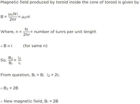 The magnetic field inside a toroidal solenoid of radius R is B. If the current through it is doubled and its radius is also doubled keeping the number of turns per unit length the same; magnetic field produced by it will be:
