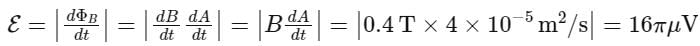 A conducting circular loop is placed in a uniform magnetic field of 0.4 T with its plane perpendicular to the field. Somehow, the radius of the loop starts expanding at a constant rate of 1 mm / s . The magnitude of induced emf in the loop at an instant when the radius of the loop is 2 cm will be ___________ μV.