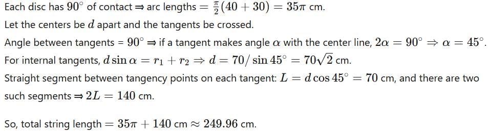 A string is wound around two circular disk as shown. If the radius of the two disk are 40 cm and 30 cm respectively. What is the total length of the string?