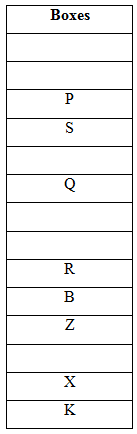 A certain number of boxes are placed one above the other. Only one box is kept between Box X and Box Z, which is placed immediately above or below Box B. Box R is placed sixth from the bottom of the stack. Five boxes are kept between Box R and Box P, which is not the topmost box. Box S is kept either immediately above or immediately below Box P. As many boxes are kept between Box S and Box R as between Box R and Box K. Three boxes are kept between Box B and Box K and both the boxes are kept below Box R. As many boxes are placed above Box S as below Box Z. Box Q is kept exactly between Box P and Box R.