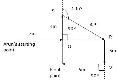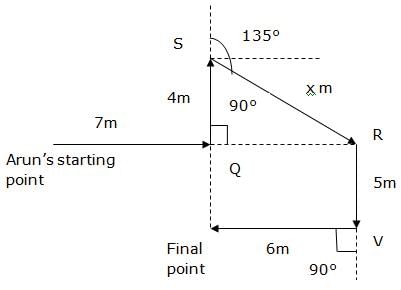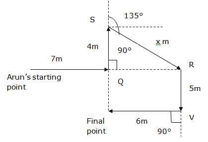 Arun walks 7m towards east and stops at point Q. From there, he turns 90° in anticlockwise direction and walks for 4m before stopping at S. Then he turns 135° in clockwise direction and walks for ‘x’ m before stopping at R which is exactly east of Q. From R, he walks 5m south and stops at V, from where he turns 90° in clockwise direction and walks 6m before he finally stops at Z, which is exactly south of S.