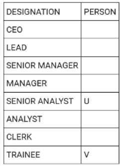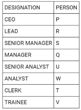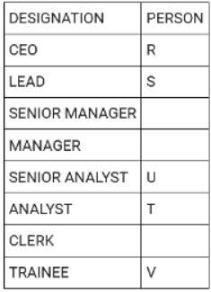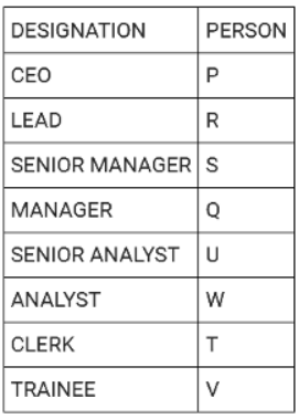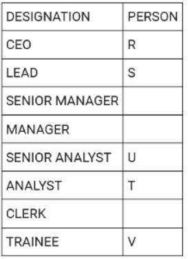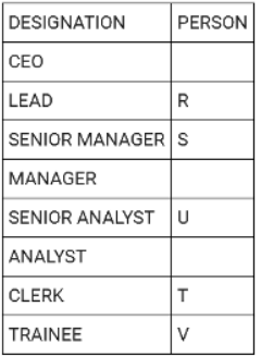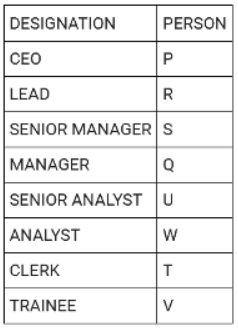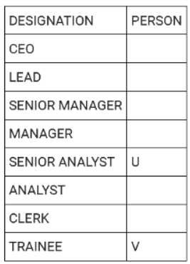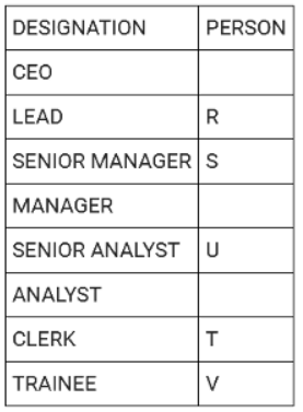 Directions: There are eight people working in a company at different positions. The designations in decreasing order are CEO, LEAD, SENIOR MANAGER, MANAGER, SENIOR ANALYST, ANALYST, CLERK and TRAINEE. U was the senior analyst and was ranked higher than T. R was ranked immediately higher than S. V is the trainee. Three people are ranked between S and T. Q was ranked higher than W but lower than P. P was not the senior manager.