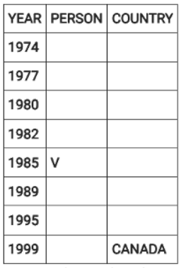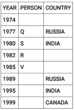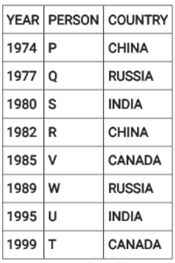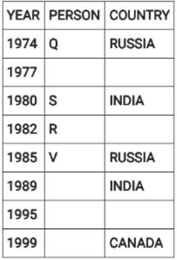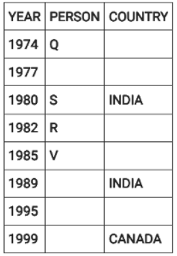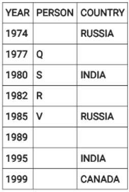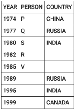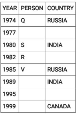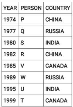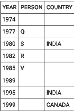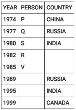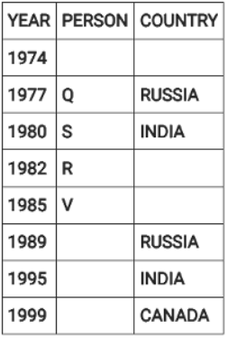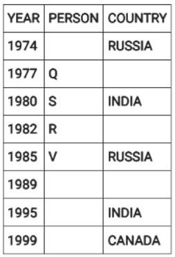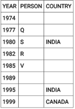 Directions: Eight people were born on 12th July but in different years among 1974, 1977, 1980, 1982, 1985, 1989, 1995 and 1999.They were born in different countries among China, Russia, India and Canada such that two people were born in each country. No two people born in consecutive years, were born in the same country. Three people were born between two people born in Russia. V was born in 1985. W was born immediately after the person born in Canada. The youngest person was born in Canada. Four people were born between Q and one of the person born in India where the former was born before the latter. U was born in India and before T. S was born in India in an even year immediately before R. P was born in China, immediately before one of the person born in Russia.