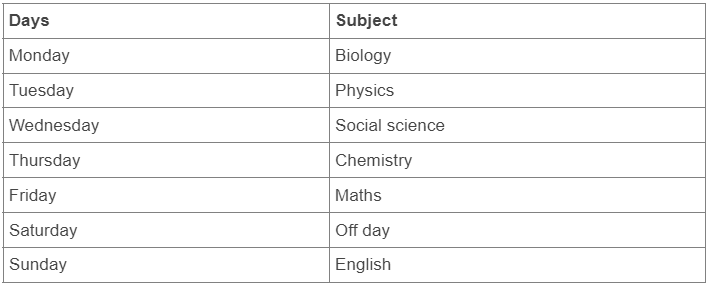 Six lectures of six subjects Chemistry, Physics, Biology, Social Science, Maths and English are scheduled in a week starting from Monday and ending on Sunday of the same week. There is only one lecture per day. Chemistry is not on Tuesday or Saturday. Physics is immediately after Biology. Social Science is not on Friday and there is one day gap between Social Science and Maths. One day prior to the schedule of English, there is no lecture (as that day is the 'off' day) and Monday is not the 'off' day.