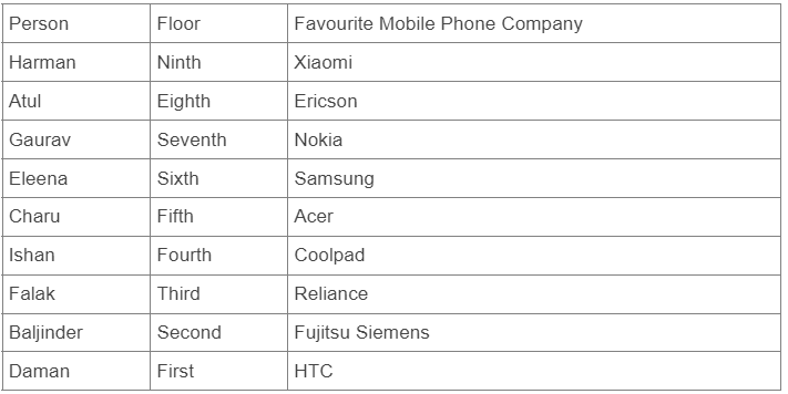 Nine friends Atul, Baljinder, Charu, Daman, Eleena, Falak, Gaurav, Harman and Ishan are living in a same apartment of nine floors counting from one to nine. First floor is numbered 1, and so on. They like different mobile phone companies viz. Samsung, Reliance, Xiaomi, Nokia, Coolpad, Acer, HTC, Fujitsu Siemens, and Ericson, but not necessarily in the same order. There are three floors between Atul and Ishan, who likes Coolpad company. Harman likes Xiaomi company and lives immediately above the floor on which Atul lives. There is only one floor between Harman and Gaurav, who likes Nokia company. Falak likes Reliance company and lives below the floor on which Gaurav lives. Falak does not live on an even-numbered floor. There are only two floors between Falak and Eleena, who likes Samsung company. Baljinder likes Fujitsu Siemens company and lives below the floor on which Falak lives. Gaurav does not live on the ninth floor. Baljinder lives on an even-numbered floor. There are as many as floors between Baljinder and one who likes Acer company, as between Atul and Charu. Atul does not like HTC company.