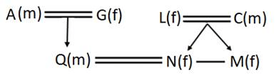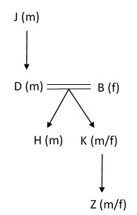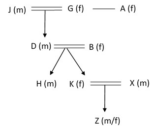 B and D are one of three married couples. A and G are two sisters and one of them is married. H, who is the uncle of Z, is the son of D. B is the daughter-in-law of J, who is the grandfather of K. G has only one granddaughter. X is the grandson-in-law of G.