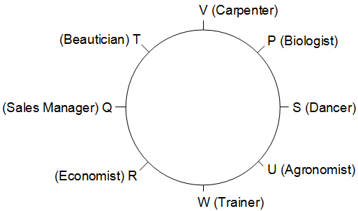 P, Q, R, S, T, U, V and W are sitting around a circular table facing the centre. Each one of them has a different profession, viz. dancer, economist, agronomist, trainer, carpenter, sales manager, biologist and beautician.